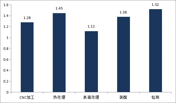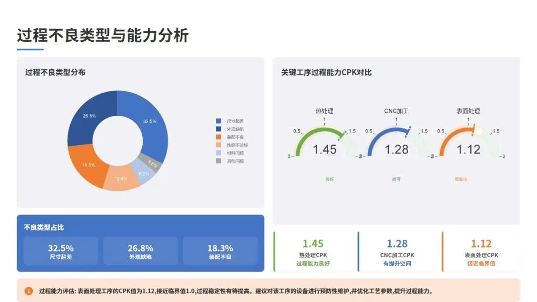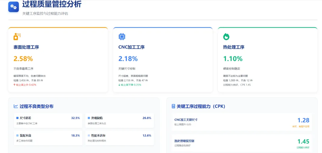 CNC加工工序的关键尺寸CPK平均值为1.28,较上周提升0.05,过程能力尚可但有提升空间;热处理工序的硬度控制CPK为1.45,过程能力良好;