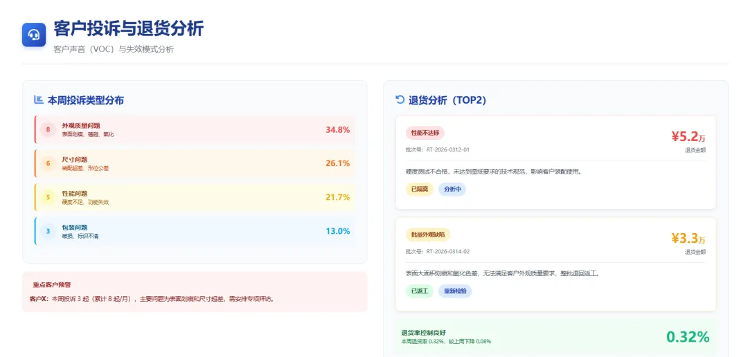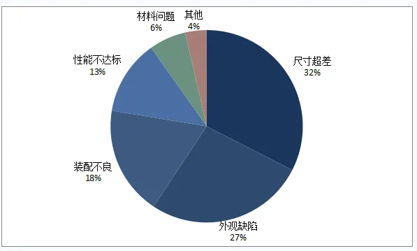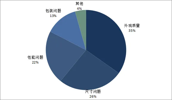 从投诉类型分析,本周客户投诉主要集中在:外观质量问题(8起,占34.8%)、尺寸问题(6起,占26.1%)、性能问题(5起,占21.7%)、包装问题(3起,占13.0%)、其他问题(1起,占4.4%)。