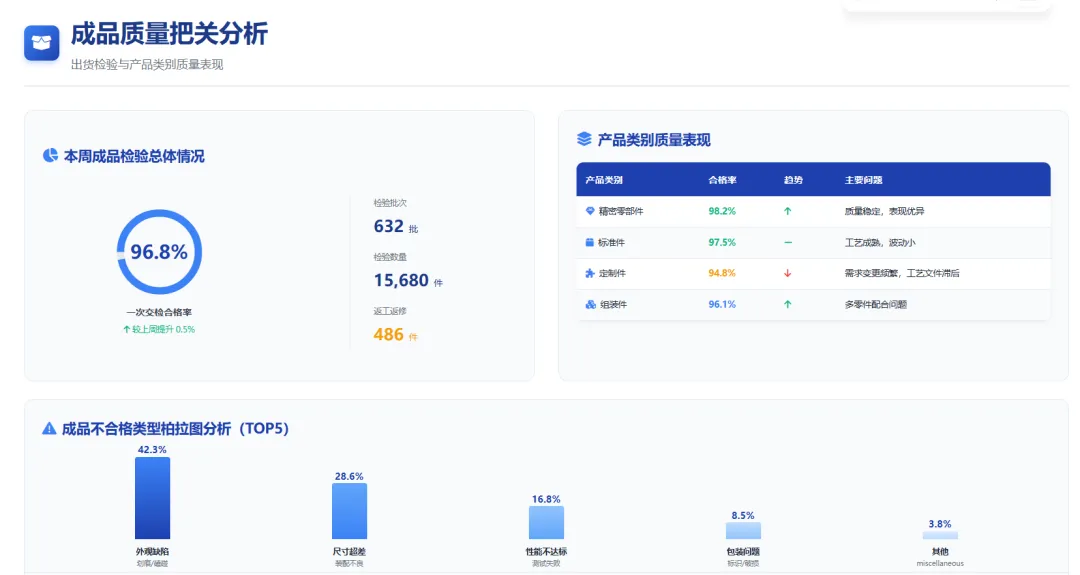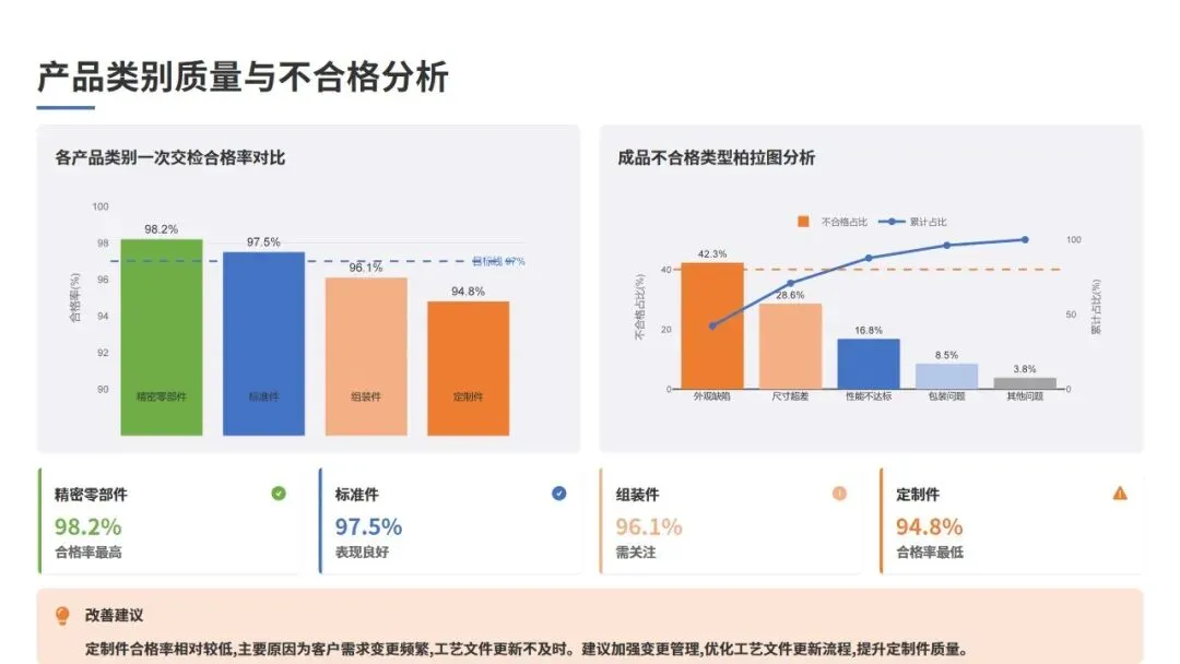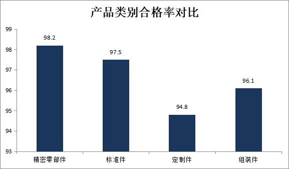 从产品类别分析,本周各类产品的一次交检合格率如下:精密零部件(合格率98.2%)、标准件(合格率97.5%)、定制件(合格率94.8%)、组装件(合格率96.1%)。其中,定制件合格率相对较低,主要原因为客户需求变更频繁,工艺文件更新不及时。