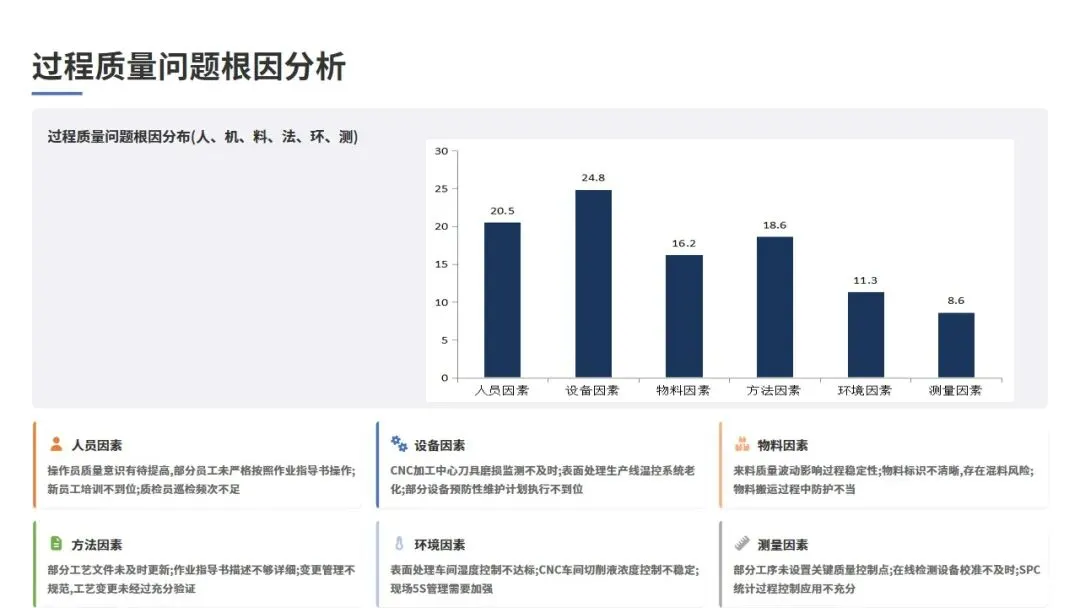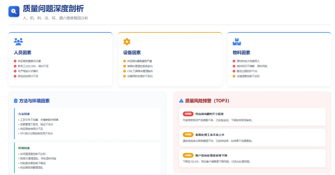 本章对本周发现的主要质量问题进行深度剖析,从人、机、料、法、环、测六个维度进行根因分析,识别问题的根本原因,为制定有效的改进措施提供依据。