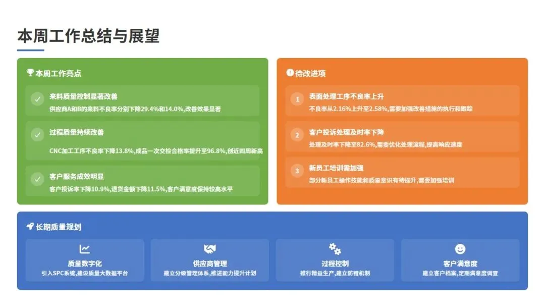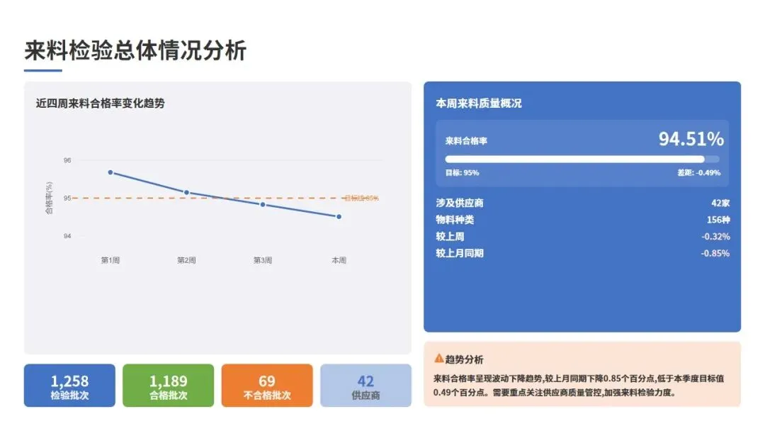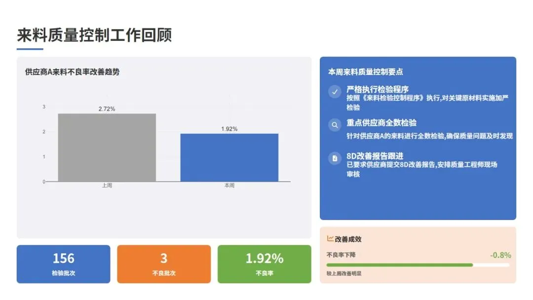 通过本周实施的改进措施,来料质量呈现以下改善趋势:供应商A的来料不良率从上周的2.72%下降至本周的1.92%,改善幅度29.4%;供应商B的来料不良率从上周的2.15%下降至本周的1.85%,改善幅度14.0%;供应商C的来料不良率虽然仍有波动,但已安排专项审核,预计下周将看到改善效果。