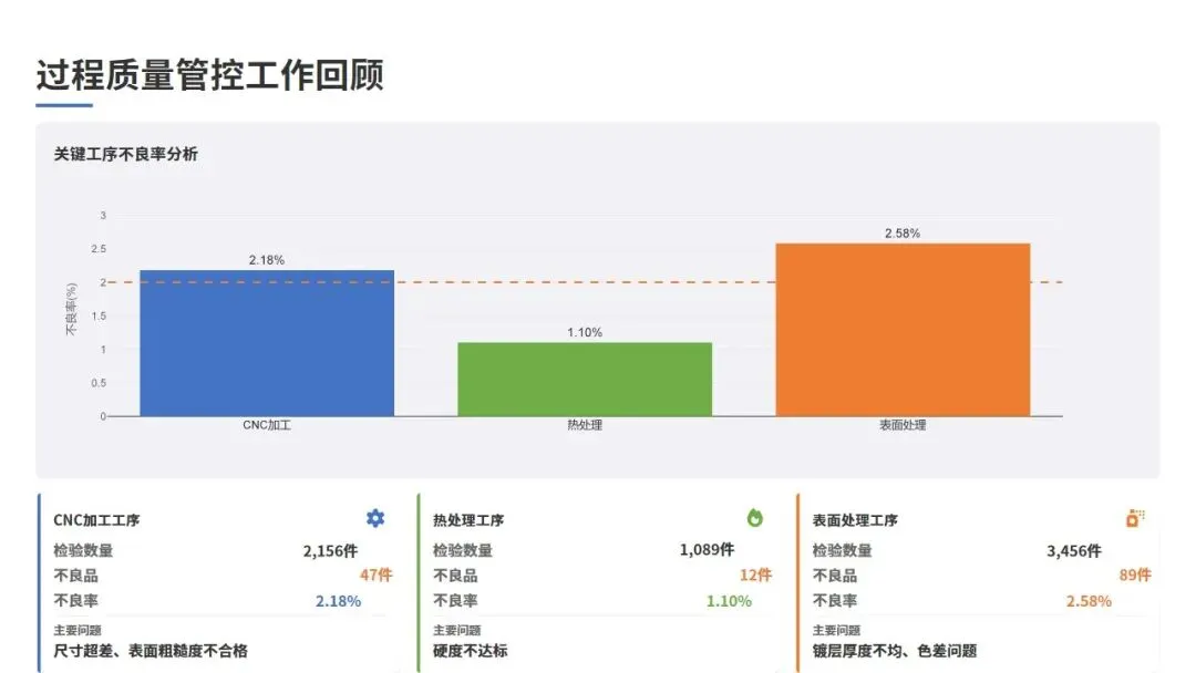 CNC加工工序共检验2,156件,发现不良品47件,不良率2.18%,主要问题为尺寸超差和表面粗糙度不合格;热处理工序检验1,089件,发现不良品12件,不良率1.10%,主要为硬度不达标;表面处理工序检验3,456件,发现不良品89件,不良率2.58%,主要为镀层厚度不均和色差问题。