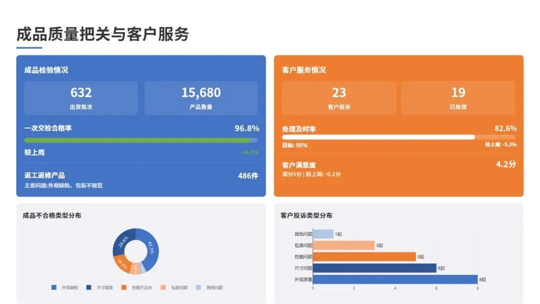 共完成出货检验632批,合计15,680件产品。一次交检合格率为96.8%,较上周提升0.5个百分点。返工返修产品486件,主要问题为外观缺陷(划痕、磕碰)和包装不规范。对于返工产品,已全部按照《返工控制程序》进行处理,并进行了重新检验。