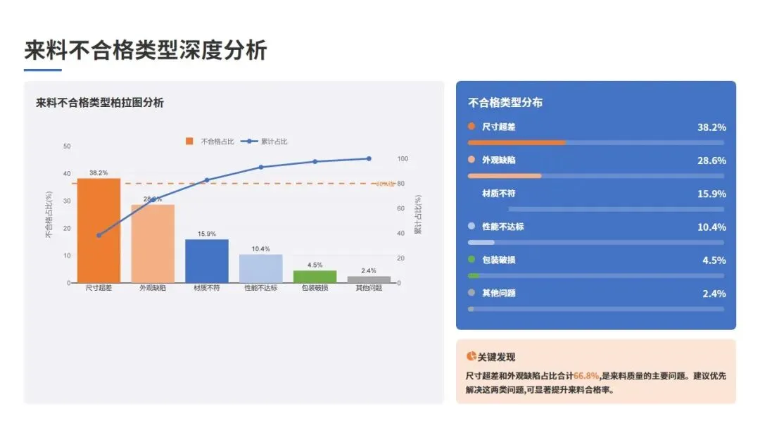本周来料不合格问题主要集中在以下几个方面:尺寸超差(占不合格总数的38.2%)、外观缺陷(占28.6%)、材质不符(占15.9%)、性能不达标(占10.4%)、包装破损(占4.5%)、其他问题(占2.4%)。