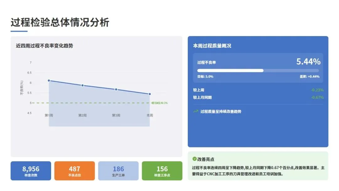(2)过程质量控制方面,CNC加工工序不良率下降13.8%,成品一次交检合格率提升至96.8%,创近四周新高;