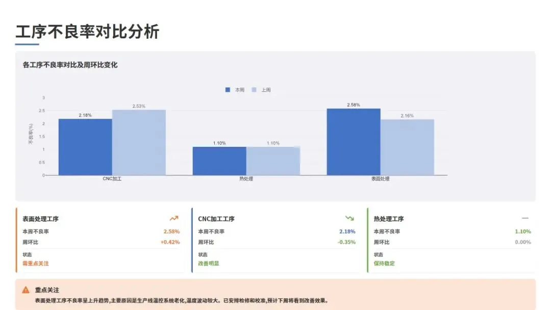 从工序维度分析,本周不良率最高的三个工序分别是:表面处理工序(不良率2.58%)、CNC加工工序(不良率2.18%)、热处理工序(不良率1.10%)。与上周相比,CNC加工工序不良率下降0.35个百分点,改善明显;但表面处理工序不良率上升0.42个百分点,需要重点关注。