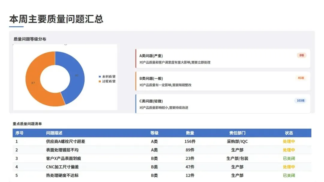 本周共记录质量问题156项,其中来料质量问题69项,过程质量问题87项(含成品检验发现的问题)。按照严重程度和影响范围,将问题分为A类(严重)、B类(一般)、C类(轻微)三个等级。A类问题8项,B类问题45项,C类问题103项。