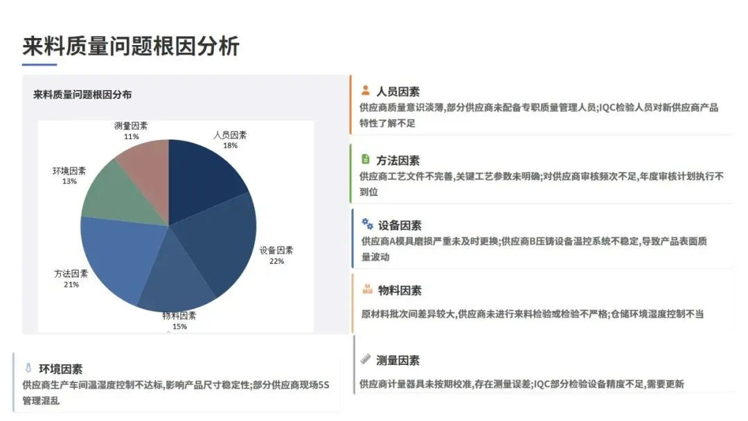 通过对本周69项来料质量问题的系统分析,运用鱼骨图和5Why分析法,识别出以下根本原因:
