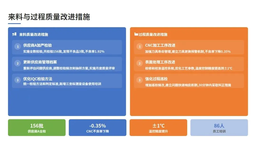 (1)来料质量控制方面,通过对重点供应商实施加严检验,供应商A和B的来料不良率分别下降29.4%和14.0%,改善效果显著;