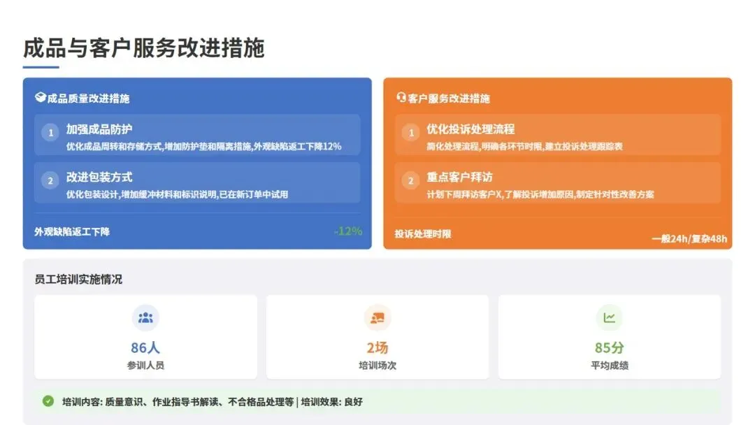 客户投诉率 | 3.20% | 2.85% | -10.9% | 改善 |