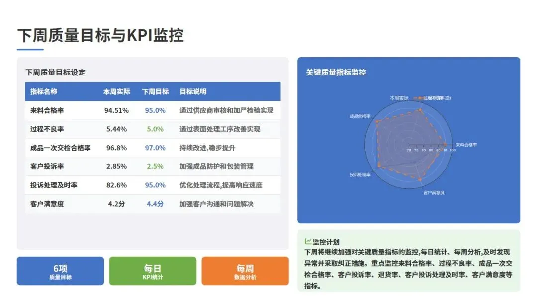 下周将继续加强对关键质量指标的监控,每日统计、每周分析,及时发现异常并采取纠正措施。重点监控以下指标:来料合格率、过程不良率、成品一次交检合格率、客户投诉率、退货率、客户投诉处理及时率、客户满意度等。