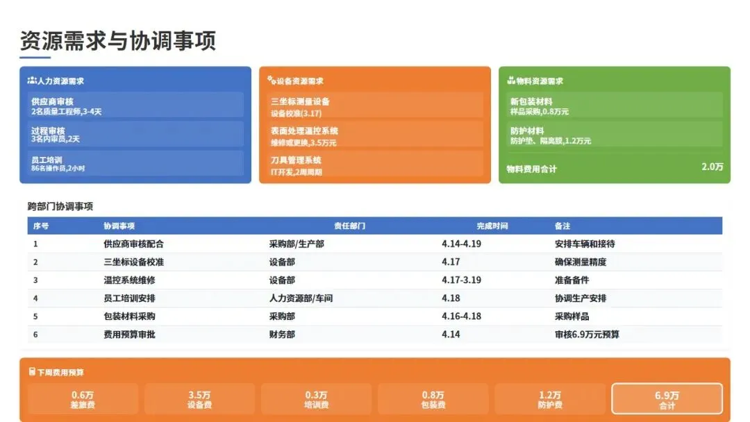 (3)刀具管理系统:需要IT部门协助开发刀具寿命管理模块,实现刀具使用数据的自动采集和预警功能,预计开发周期2周。