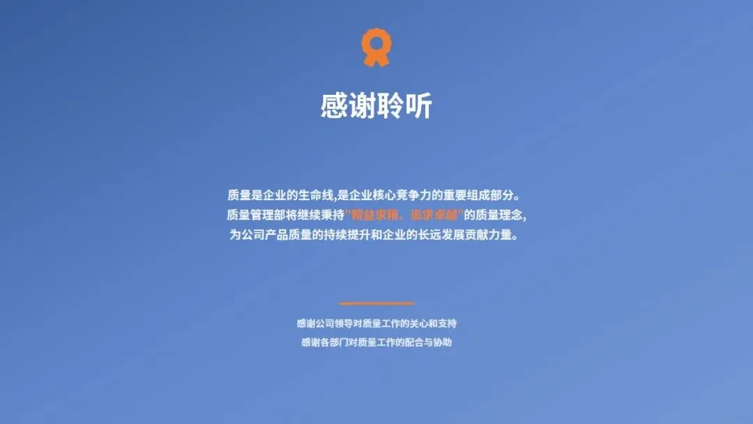 感谢公司领导对质量工作的关心和支持,感谢各部门对质量工作的配合与协助。质量管理部全体员工将以更加饱满的热情、更加务实的作风、更加有力的措施,推动公司质量管理工作再上新台阶!