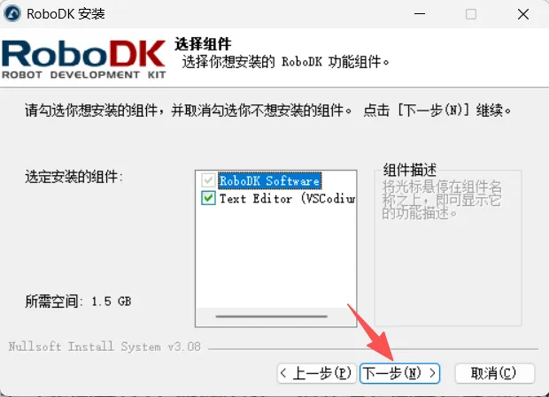 4.选择组件,点击“下一步(N)”,保持默认勾选即可(建议包含Text Editor)。