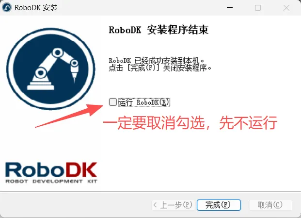 7.完成设置,至关重要! 在最后一步弹出的窗口中,取消勾选“运行 RoboDK(R)”选项,点击“完成(F)”,此时不要手动去打开软件。