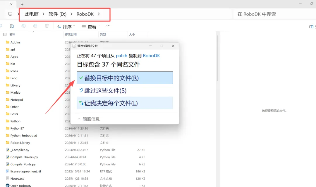 •粘贴到你刚才设置的 RoboDK安装目录(例如 `D:\RoboDK\`)。
