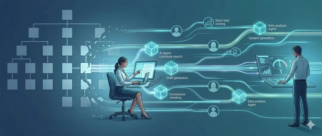 从"所有人组成的团队"变成"人+Agent组成的混合团队"。一个典型的销售团队可能需要包含线索评分Agent、内容生成Agent和数据分析Agent。团队的绩效评估标准也需要重新设计。