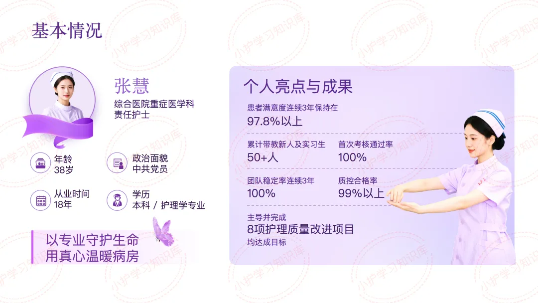 这些数字背后,是每一天对专业的敬畏和对初心的坚守。我曾获得“优质护理服务先进个人”、“重症护理操作能手”等荣誉,这些肯定激励着我不断前行。