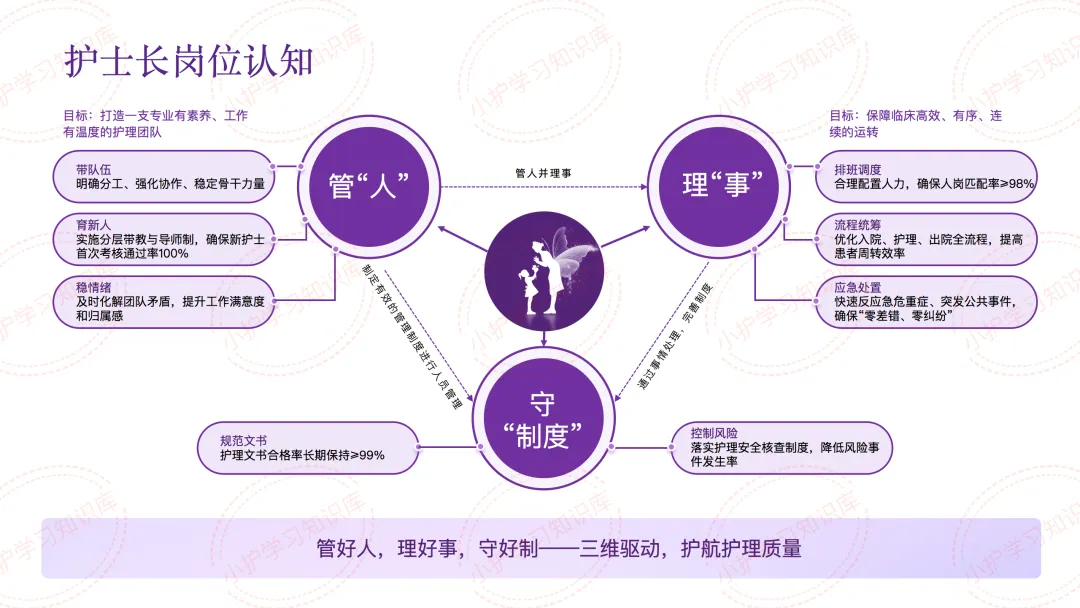 在“守制度”上,要通过规范文书和风险控制,使护理文书合格率长期保持≥99%,并降低安全事件发生率。这个三维模型,是我对岗位职责的系统化思考。