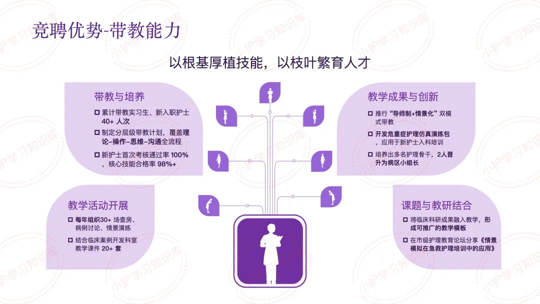 在教学能力上,我年均开展教学活动30余场,推行“导师制+情景化”带教,新护士核心技能合格率达98%以上。