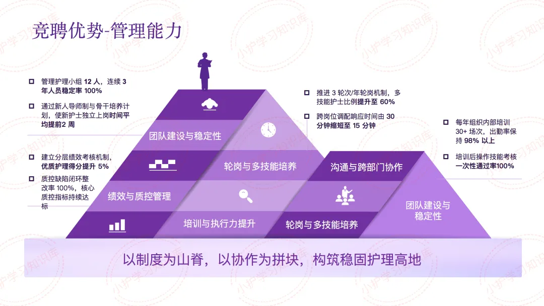 具体而言,在“管人”上,要致力于打造专业有温度的团队,通过明确分工、分层带教和情绪关怀,提升团队凝聚力与稳定性,我的团队稳定率已连续3年保持100%。
