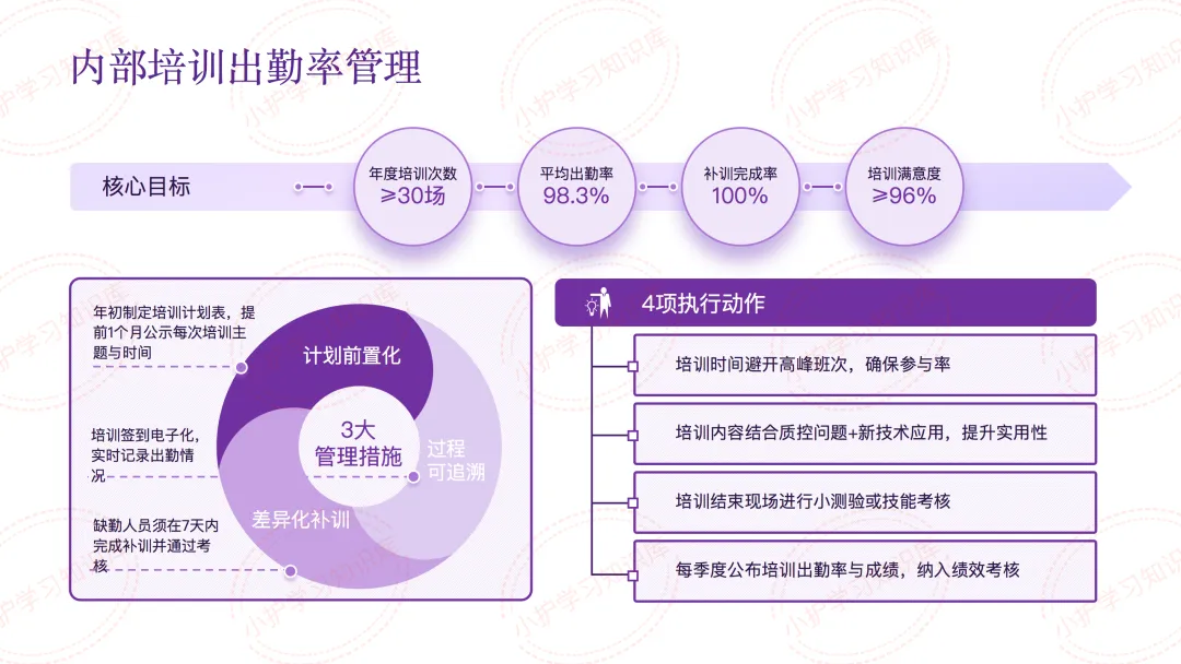 在培训管理上,我将确保年度培训不少于30场,平均出勤率达到98.3%,并通过差异化补训保证效果。
