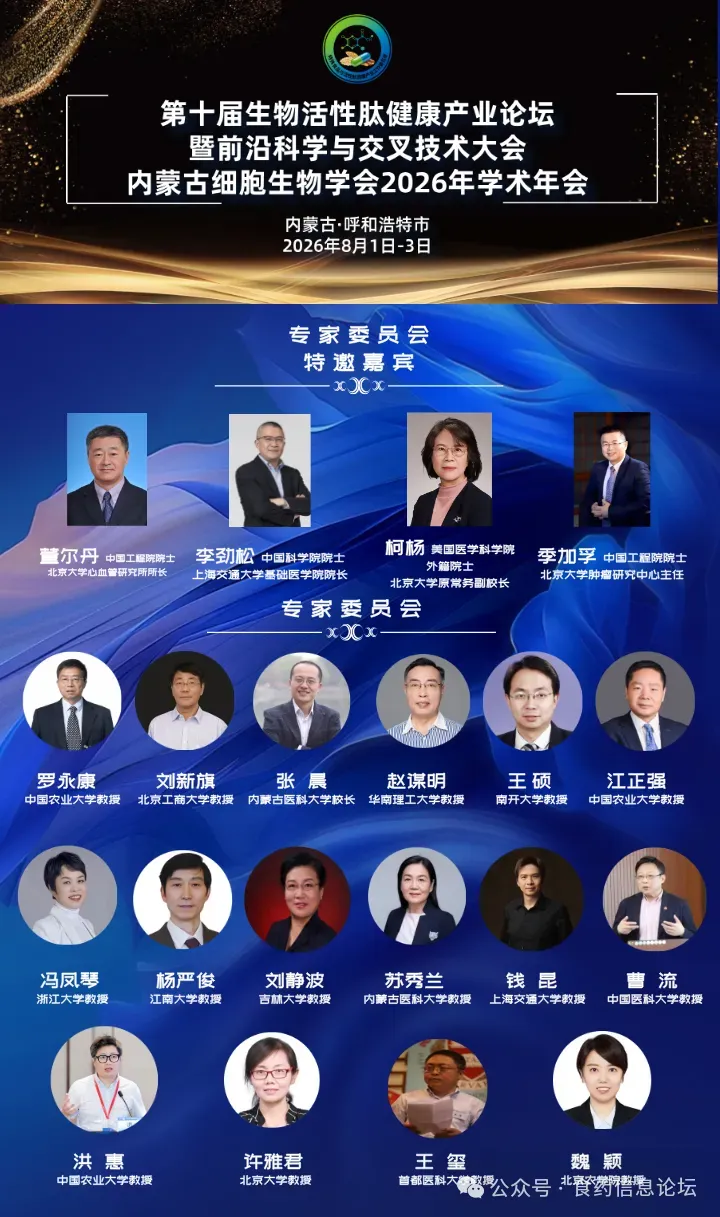 为打破基础研究与临床应用的壁垒,推动细胞生物学与生物活性肽产业的深度融合,中国生产力促进中心协会特殊食品与活性肽健康产业工作委员会联合内蒙古细胞生物学会定于2026年8月1-3日在内蒙古呼和浩特市举办“第十届生物活性肽健康产业论坛暨前沿科学与交叉技术大会及内蒙古细胞生物学会2026年学术年会”。本次大会将以“细胞调控与转化医学:生物活性肽助力健康”为核心,汇聚生物活性肽、细胞生物学、生物化学、临床医学及生物制造领域的顶尖智慧,与国家战略(健康中国、科技兴蒙)深度融合,促进内蒙古地区生物医药产业发展,助力国家健康产业创新体系建设。为此真诚欢迎科研院所、专家学者、相关企业以及业界同仁莅临本次会议,共谋发展大计。