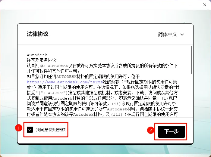 5.勾选【我同意使用条款】,然后点击下一步