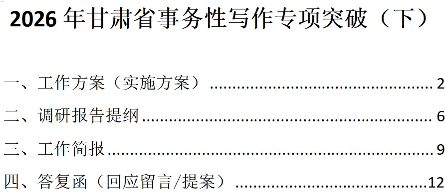时间紧、任务重,马上学习甘肃省事务性写作专项突破,8类考题必须全部学会,今天学习工作方案、调研报告、工作简报、答复函。