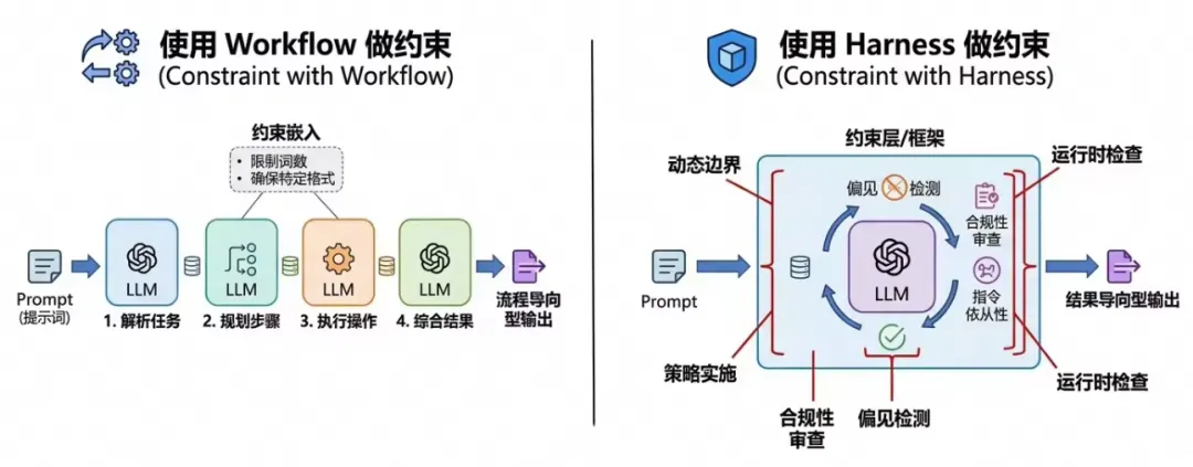 Workflow约束:更多是指传统的、硬编码的业务流程编排。在这种模式下,开发者预先定义好了一条固定的执行路径(Step A → Step B → Step C),大模型仅仅被当作其中的一个“节点”,负责在既定环节中完成特定的子任务(如提取参数、生成文案、规划步骤等等)。它的优势是确定性极高、运行速度快且易于调试,但缺点也非常明显:一旦遇到预设流程之外的异常或复杂分支,整个链路容易断裂,缺乏动态调整的能力。从这里可以看出,大模型只是执行者,主导权在“人”的手里。 Harness约束:通常指基于框架的动态约束,是一种更高级的“软约束”。它不再强制规定死板的线性路径,而是为大模型提供一个包含工具集、状态记忆和反思在内的一种系统机制,这个机制叫做Harness。在这个机制内,Agent大模型依然拥有自主规划(Planning)和循环迭代(Looping)的权利,它可以自己决定调用哪些工具,如果结果不满意可以自我反思并重新尝试,或者根据上下文动态路由或调整。由此可见,Harness只是辅助AI更好地完成任务,主导权仍在“AI大模型”手里。