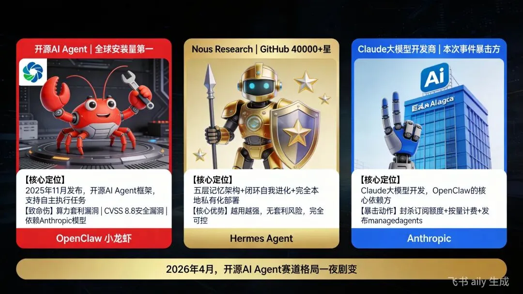 2026年4月,开源AI Agent赛道迎来史上最剧烈震荡:OpenClaw(社区称"小龙虾")因算力套利漏洞+安全漏洞被Anthropic封杀,生态一夜崩塌 Hermes Agent趁势崛起,GitHub狂揽4万+星,成为开源Agent新标杆 Anthropic连出重拳:封杀订阅→按量计费→发布managedagents,三连暴击彻底终结OpenClaw市场空间。