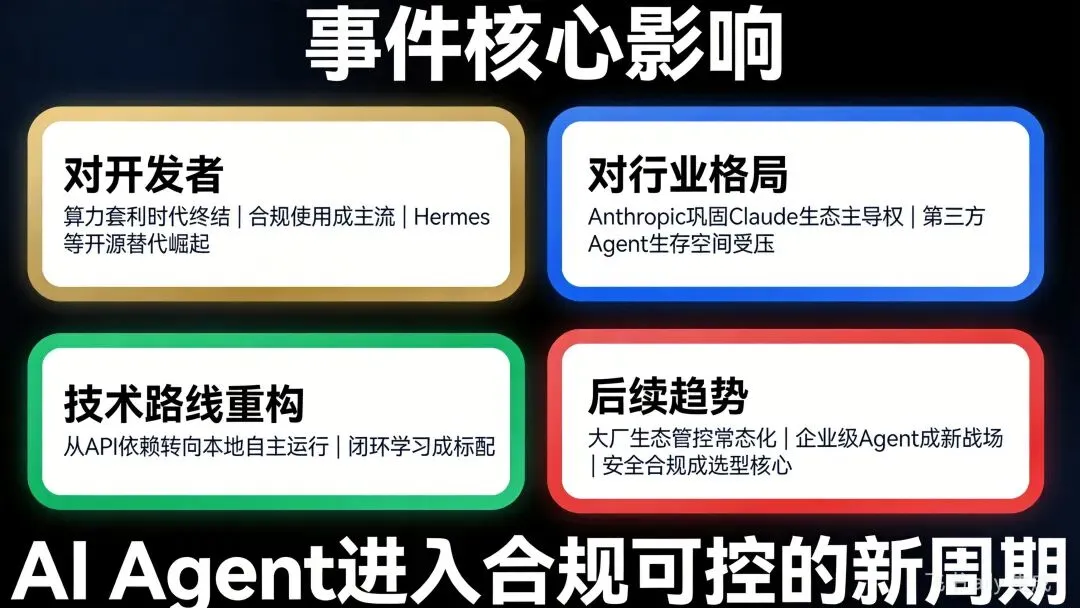 算力套利时代终结:Anthropic封杀彻底堵死低价API牟利路径,AI Agent进入"按量计费、合规使用"新阶段 开源替代方案崛起:Hermes等本地部署、自我进化的开源Agent成为主流,企业倾向选择可控安全的私有化方案 技术路线重构:从"依赖大模型API"转向"本地自主运行+闭环学习",架构逻辑彻底升级