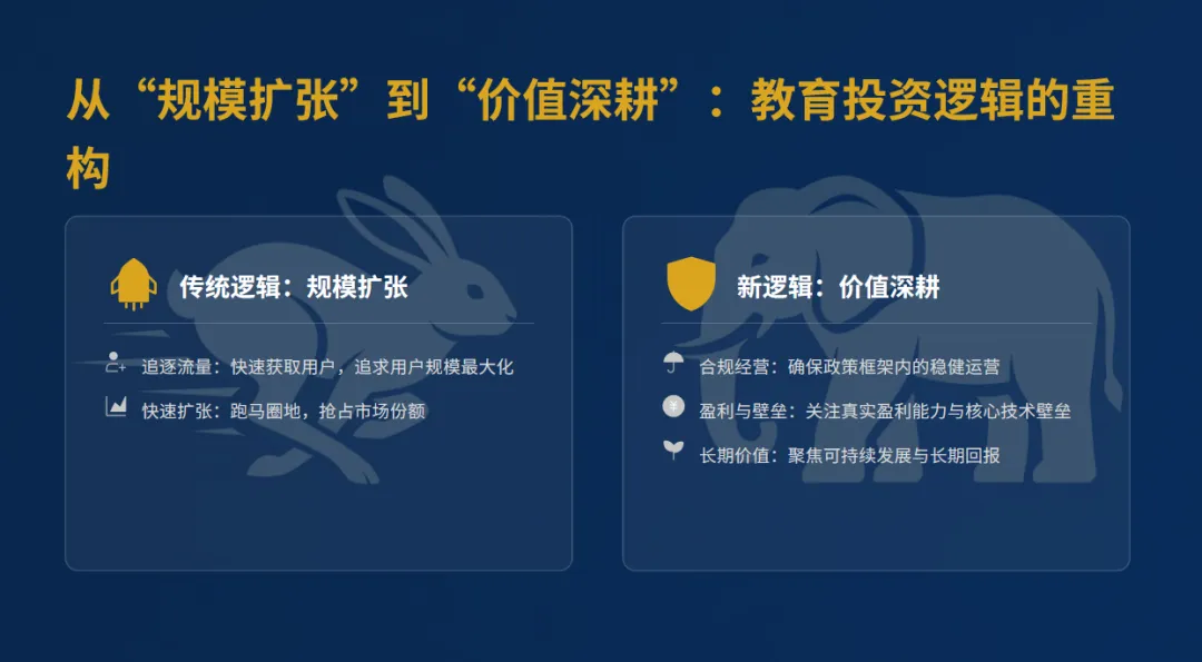 首先,我们必须清醒地认识到,教育赛道的“野蛮生长”时代已经彻底结束,现在已经进入“合规生存”的下半场。这不是一句口号,而是我们每一个投资人、每一个从业者,必须面对的现实。当下行业的两大核心挑战,直接决定了我们的投资逻辑和方向。