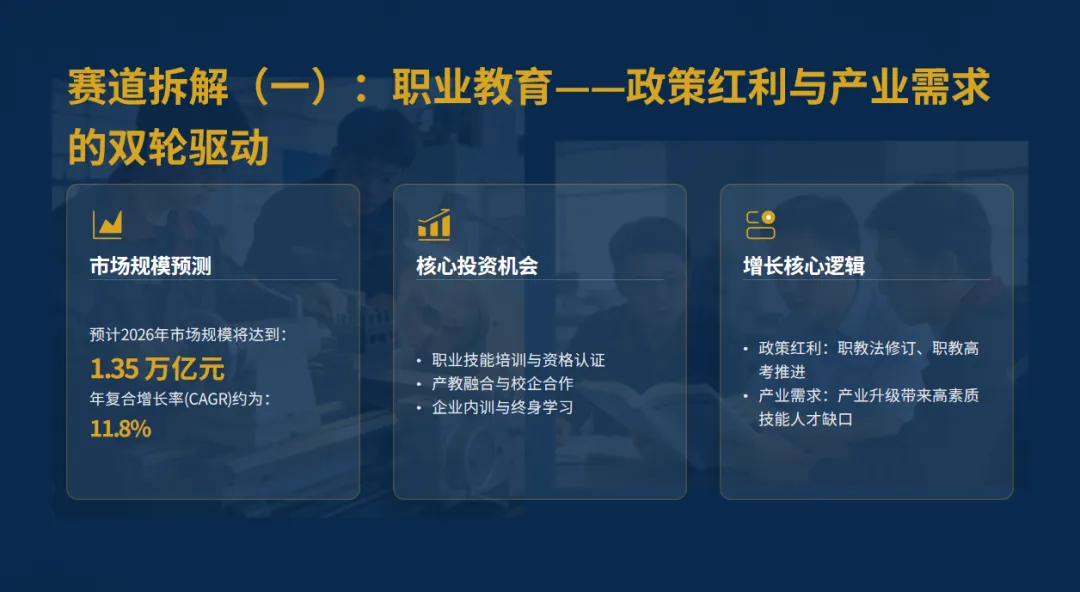 在这样的背景下,我们首先要找的,是“确定性机会”——也就是政策支持、市场需求旺盛、合规风险低的赛道。结合我多年的一线经验,这个赛道,就是职业教育,以及与之深度绑定的产教融合。