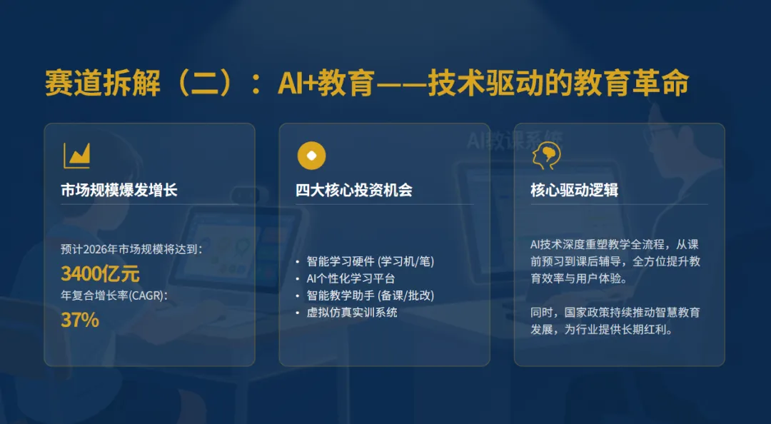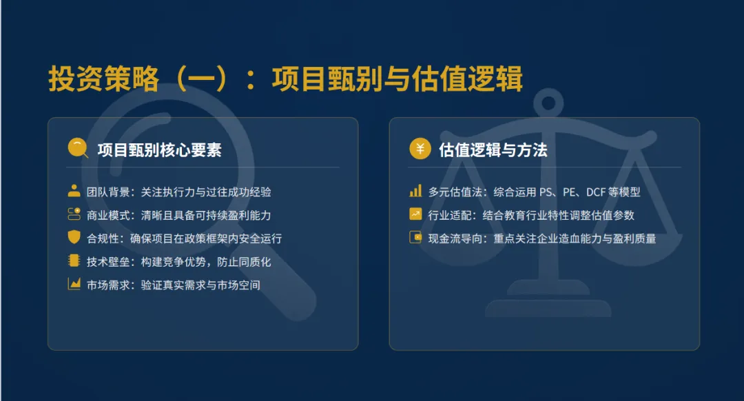 总结一下这一部分:当下教育行业,合规是生存底线,人口变化是市场背景,AI技术是破局关键。我们投资的第一步,就是认清这个现实,放弃过去的侥幸心理,聚焦“合规+价值”,寻找真正能解决行业痛点、符合政策导向、有技术支撑的项目。