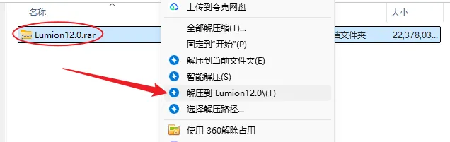 1.鼠标右击【Lumion 12.0 】压缩包(win11及以上系统需先点击“显示更多选项”)选择【解压到 Lumion 12.0 】。