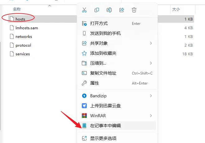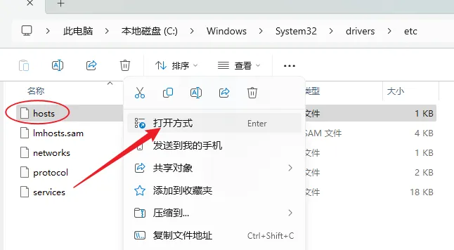 17.打开路径地址:C:\Windows\System32\drivers\etc,鼠标右击【hosts】选择【打开方式】。