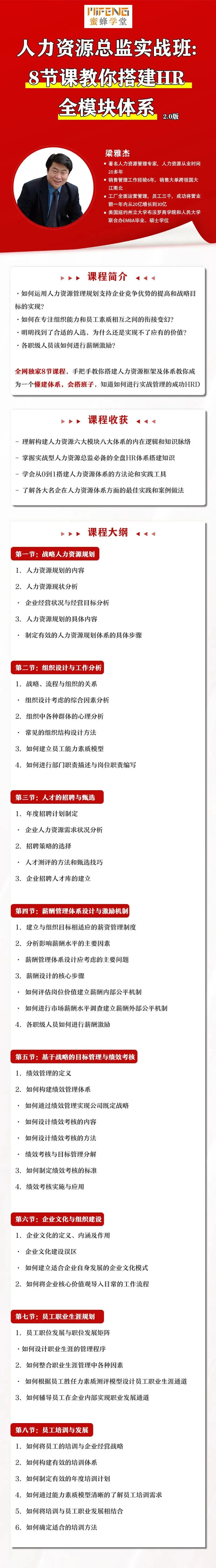 因此HR的通盘能力在任何时候都很重要,为了帮助大伙儿在短时间内提升自己、打通人力资源六大模块,我们本期特邀著名人力资源管理专家、北大清华MBA导师梁雅杰老师的全模块视频系列课: