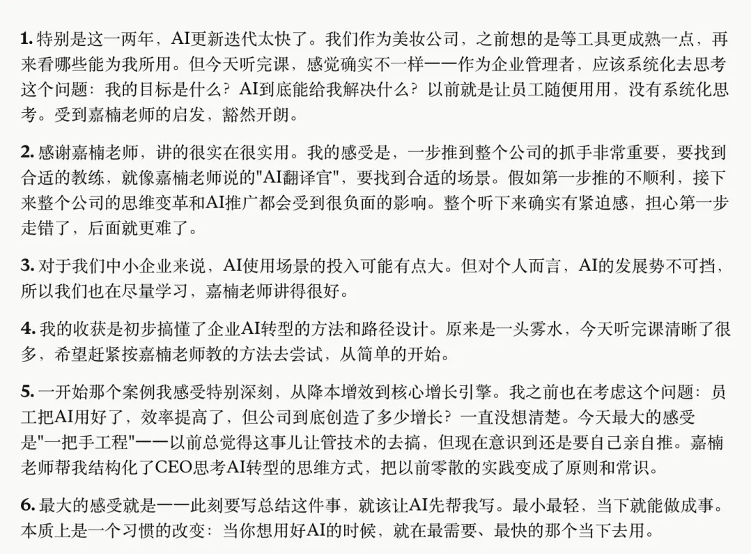 老师帮我结构化了CEO思考AI转型的思维方式,把以前零散的实践变成了原则和常识。