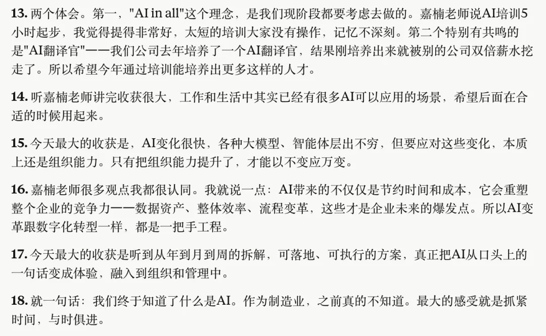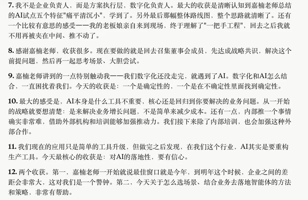 两天闭门会中,参会学员反响热烈。有企业负责人坦言“从焦虑到豁然开朗”,有数字化负责人感慨终于明确了“AI是一把手工程”,不再被夹在高管与基层之间被动推进。还有的反馈:“真正给企业提供了长短期结合的方案和方向”。