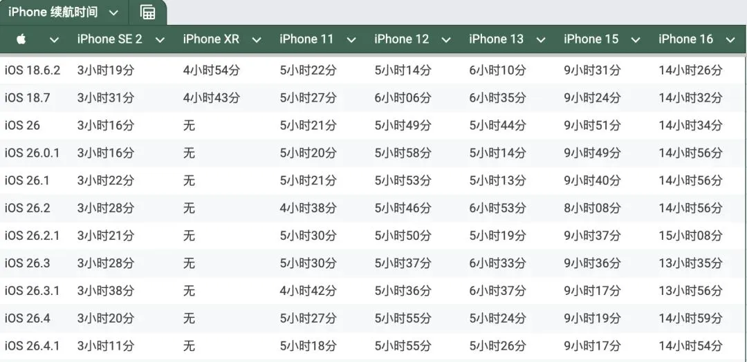 此次实测数据清晰展现了各机型续航变化,具体对比结果如下:iPhone 16升级后续航时长为14小时54分,相比iOS 26.4减少5分钟;iPhone 15续航9小时17分,减少2分钟;iPhone 13续航5小时26分,反而提升2分钟;iPhone 12续航5小时55分,与上一版本完全持平;iPhone 11续航5小时18分,减少9分钟;iPhone SE 2续航3小时11分,同样减少9分钟。