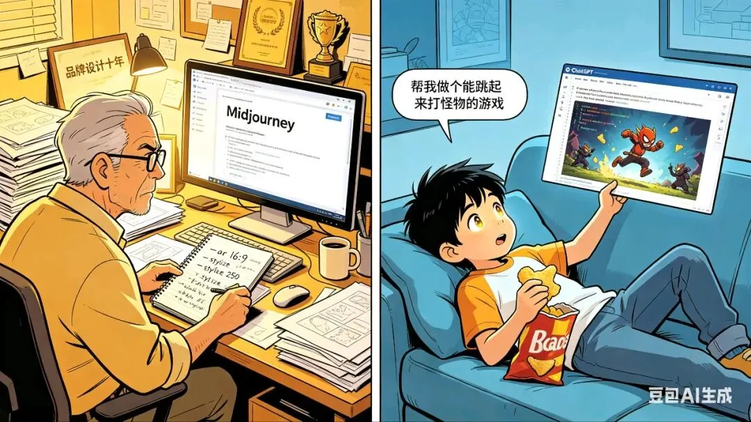 而另一个画面是朋友家的小孩,十岁,连Python的P都拼不全。他打开ChatGPT就像打开冰箱拿饮料一样自然,说了句"帮我做个能跳起来打怪物的游戏",然后就去吃薯片了。三小时后他拿着跑通的代码给我看,眼睛发亮,不是因为他"学会了编程",而是因为他"让事情发生了"。他已经发布了三个这样的小游戏,每个都是AI写的代码,AI画的素材,但他不在乎,他只在乎"好玩"。