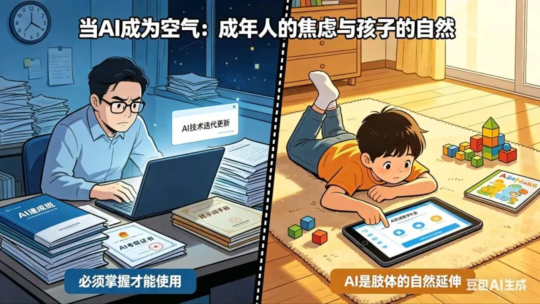 但那个十岁小孩从来没有想过"学AI"这件事,就像你不会去想"我要不要学一下怎么用自己的右手"。对他而言,AI是环境的默认设置,是像空气一样的基础设施,是肢体的自然延伸。