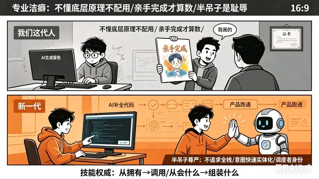我们这代人对"专业"有一种近乎洁癖的尊严。我们相信"不懂底层原理就不配使用",相信"亲手完成"才算数,相信"半吊子"是一种耻辱。