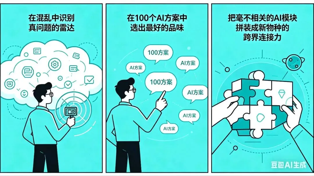 第三,培养那三种AI抢不走的核心肌肉:在混乱中识别真问题的雷达,在100个AI方案中选出最好的品味,以及把毫不相关的AI模块拼装成新物种的跨界连接力。