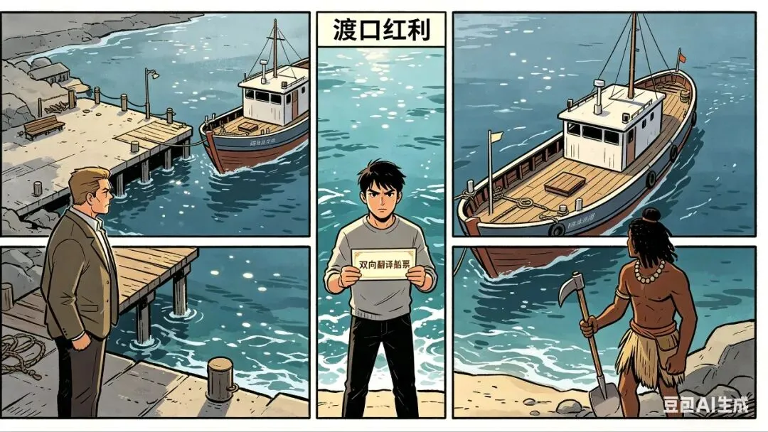 而我们现在正站在一个文明级的渡口。旧大陆的码头还没拆,新大陆的渡船刚刚靠岸,潮水涨落之间有一个狭窄的窗口。这就是"渡口红利":旧岸的专家看不清新规则,不敢上船;新岸的原住民缺乏旧世界的深度积累,无法回来挖掘宝藏。而站在渡口的人,手里拿着双向翻译的船票。