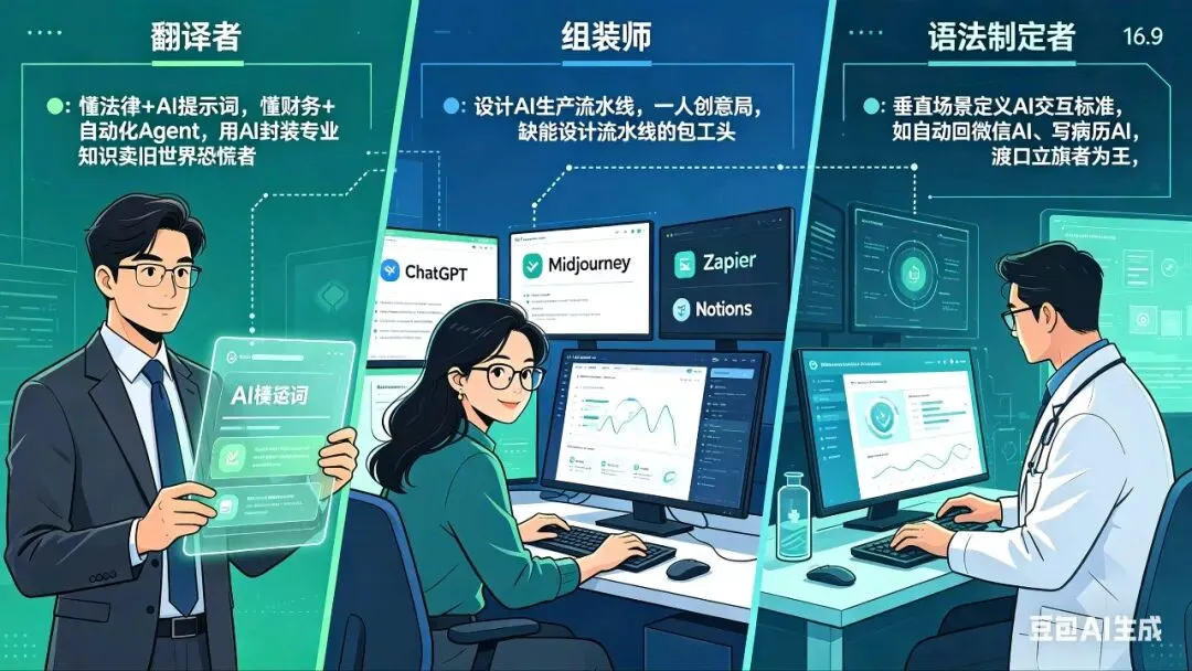 第一类是"翻译者"——那些既懂法律又懂AI提示词,既懂财务又懂自动化Agent的人。他们用AI把专业知识封装成产品,卖给旧世界还在恐慌的人。