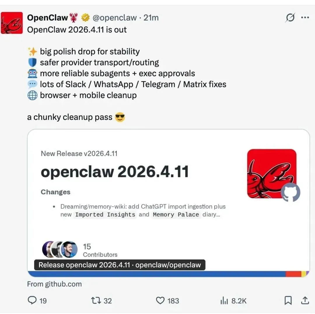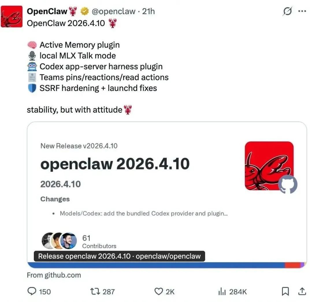从v2026.4.7到v2026.4.11,GitHub上的更新日志不断刷新,X主页被密密麻麻的功能迭代填满,甚至出现24小时内两更的“狂飙”节奏;
