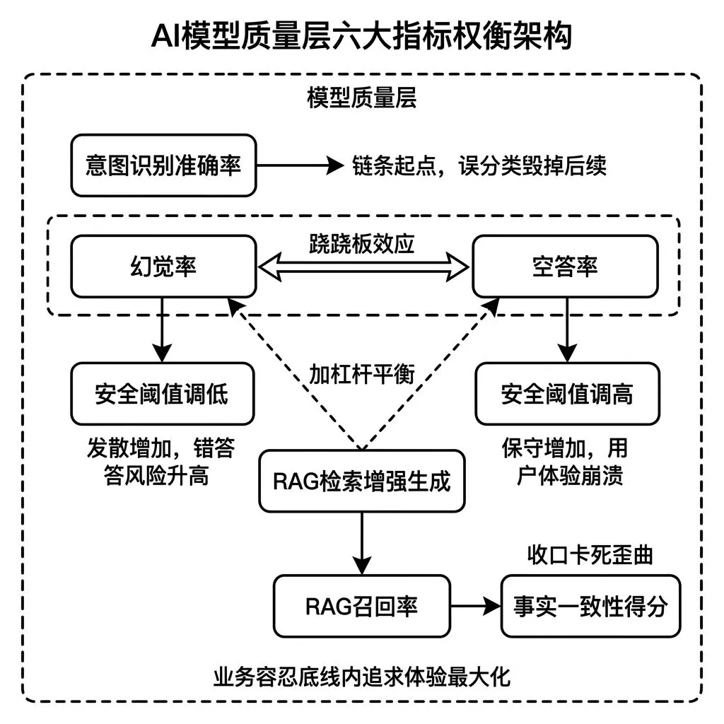 模型层的数据全是在测系统底座敢不敢回答。以下这六个指标互相咬合,形成一条完整的链路:意图识别负责听懂用户在说什么,RAG 召回负责找答案,事实一致性负责看模型有没有篡改,幻觉率和空答率像跷跷板一样此消彼长。链路上任何一环塌了,解决率都不可能好看。