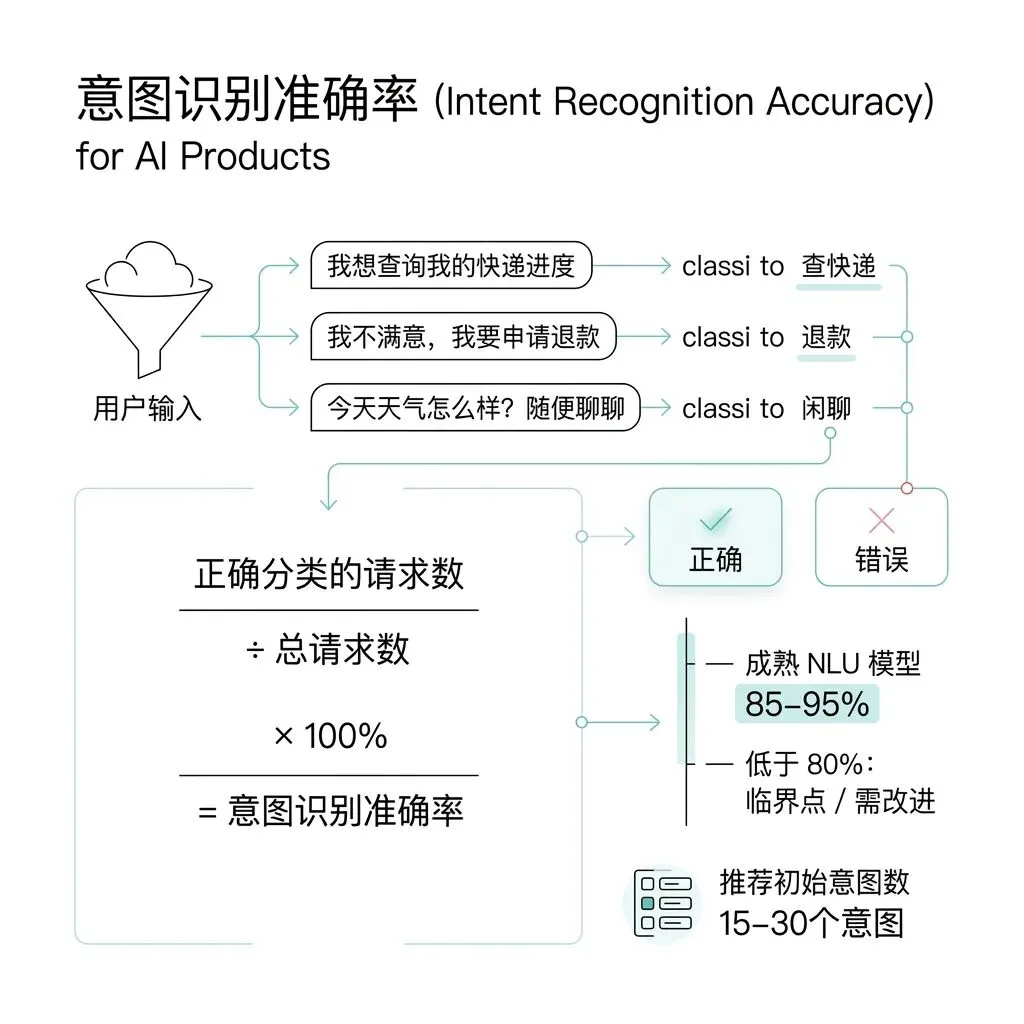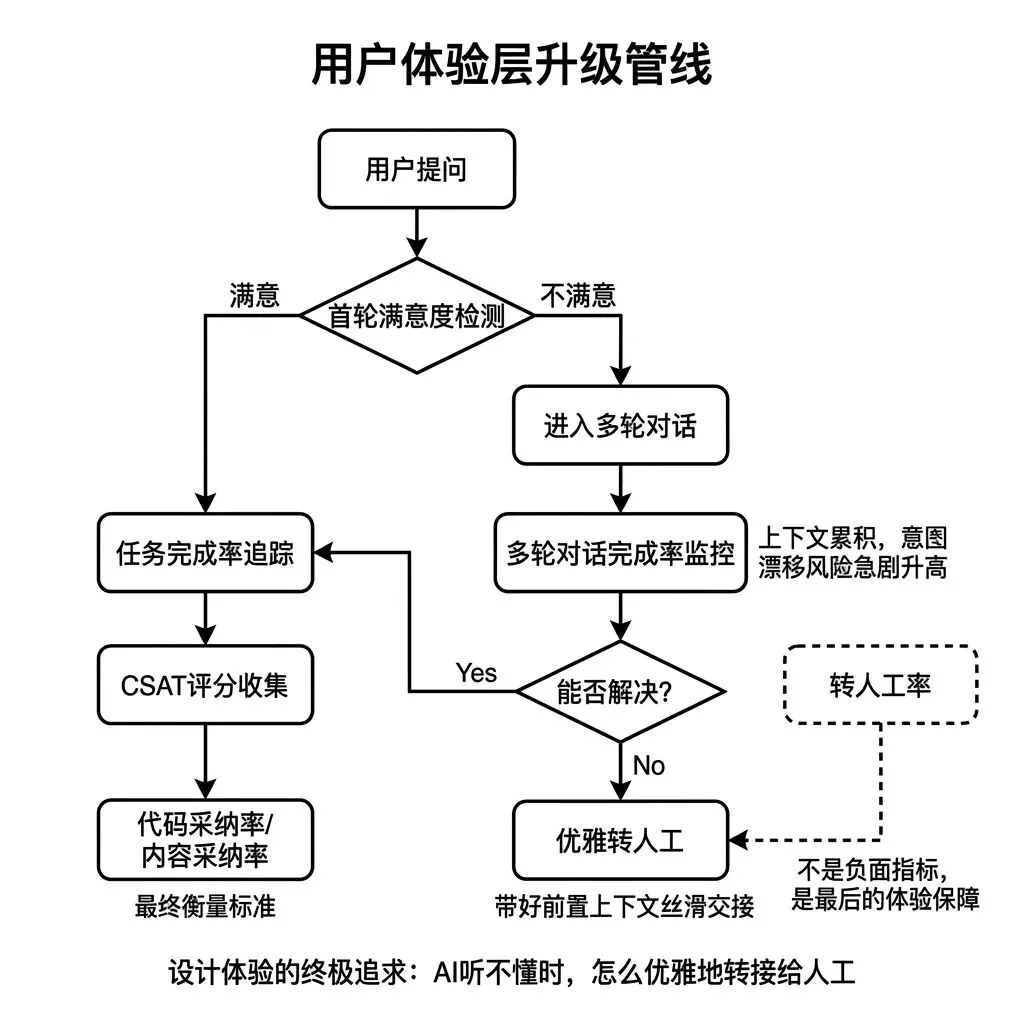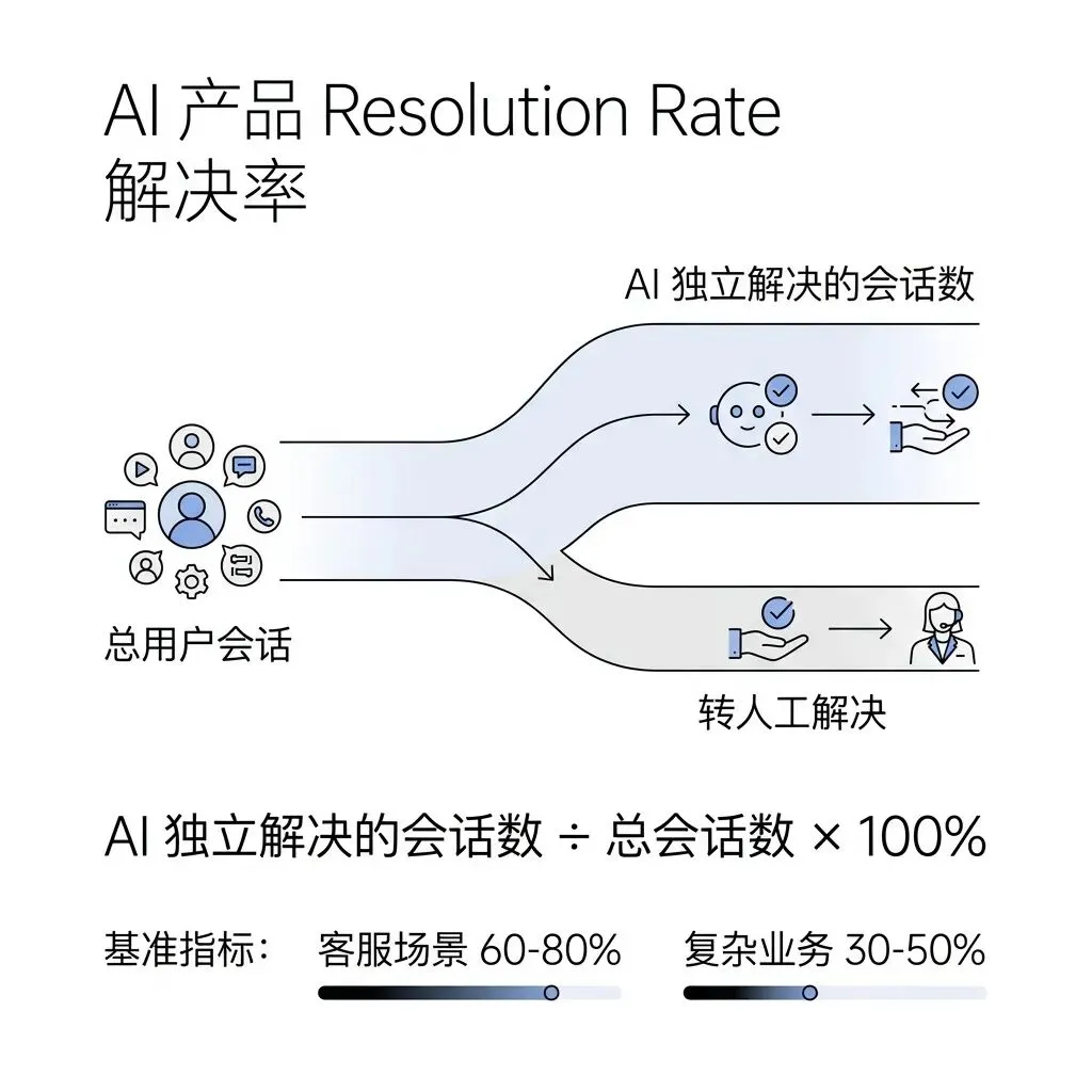 这个指标是整个 AI 产品最上层的结果性数字,直接反映系统的端到端能力。用户带着问题进来,AI 独立完成解答、用户确认满意、全程无需转交人工,才能算一次有效解决。它不是某个模块的局部得分,而是意图识别、知识检索、生成质量、交互设计等全链路协同的最终产出。